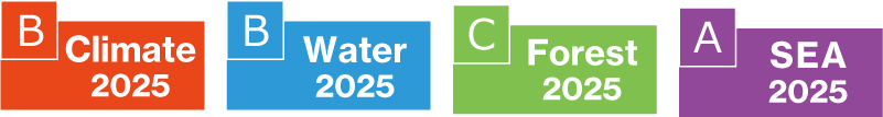 CDP2025「気候変動」、「水」において「B」評価、「森林」に関しては「C」評価となりました。また、「サプライヤーエンゲージメント評価(SEA)」において、最高評価である「A」評価を獲得しました。